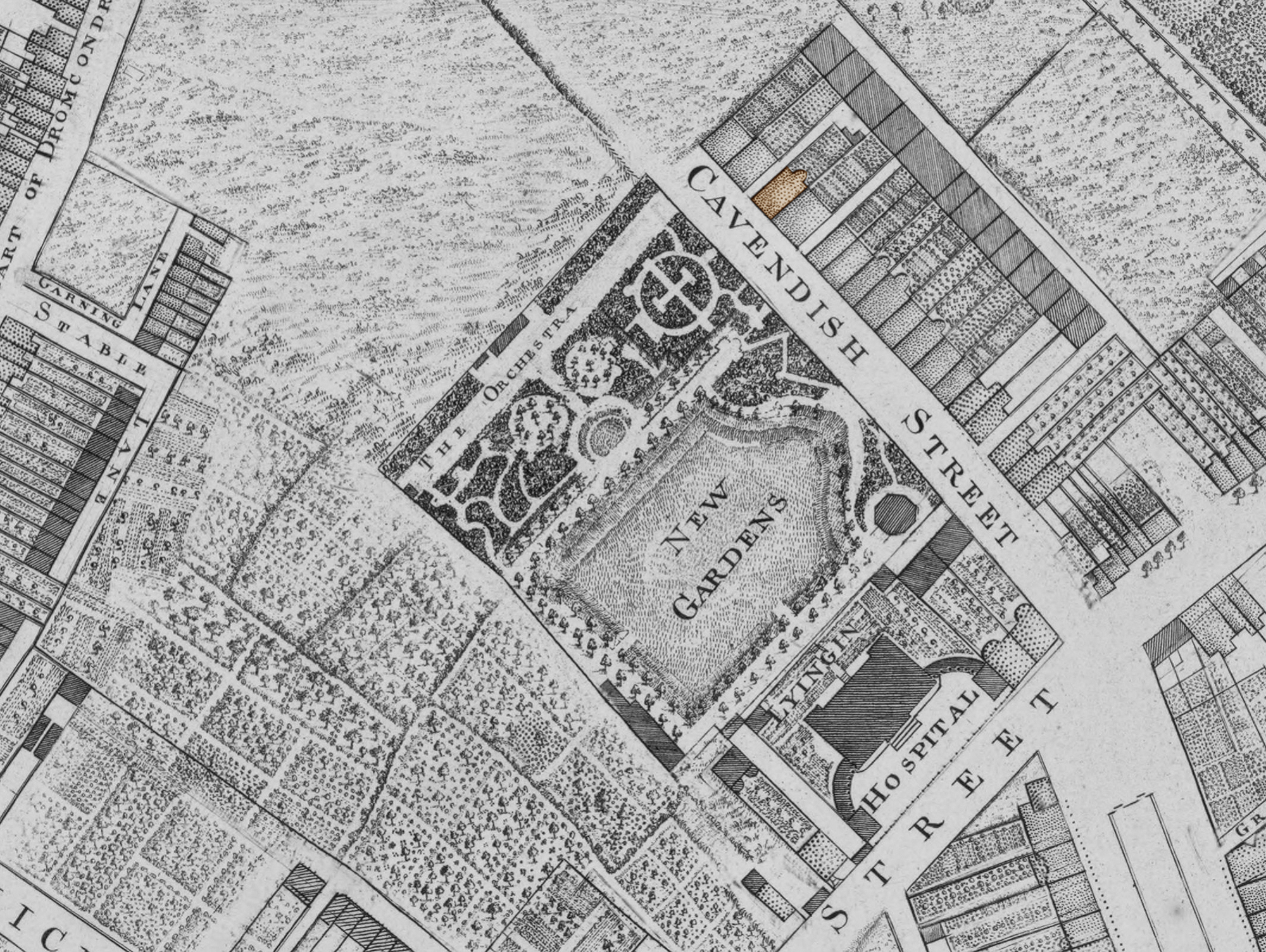 Figure 2: An extract from John Rocque’s AN EXACT SURVEY of the CITY and SUBURBS of DUBLIN (1756) showing the row of houses completed on the east side of the “New Gardens” designed by Robert Stevenson to generate income for the “lying in” hospital founded by Bartholomew Mosse (1712-59). The pleasure grounds included an elm tree-lined bowling green with a coffee room on the south side and winding pathways on the north side leading to an area named “The Orchestra”. A revision of Rocque’s map, AN ACCURATE SURVEY of the CITY and SUBURBS of DUBLIN by Mr. Rocque with Additions, and Improvements, By Mr. Bernard Scalé to 1773 (1773), illustrates the completed square with Granby Row on the west and Palace Row on the north. The square was officially renamed in honour of Charles Manners (1754-87), fourth Duke of Rutland and Lord Lieutenant of Ireland, in 1785 under an Act of Parliament for the completing and effectually lighting and watching Rutland Square, and for the better support and maintenance of the hospital for the relief of poor lying-in women in Great Britain Street, Dublin, and for other purposes therein mentioned