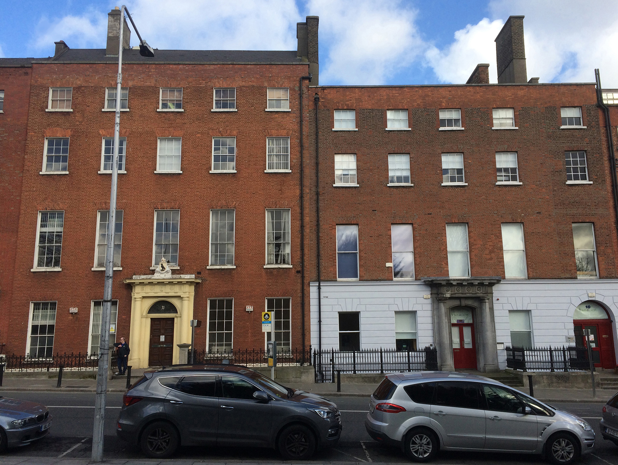 Numbers 10 and 11 appear to have been built as an informal pair. Originally each plot was bounded on the north and south extremities by a carriageway, ten feet wide, giving access to the mews backing on to Rutland Place so that the houses originally showed asymmetrical façades four windows wide and four storeys high over a railed-in basement. In what would quickly become the standard for Georgian domestic architecture in Dublin, number 11 is externally austere, the stone work enlivening a plain front of red brick limited to an intricately-carved limestone Doric doorcase, subsequently overpainted, and the granite used for steps, sills and parapet coping.