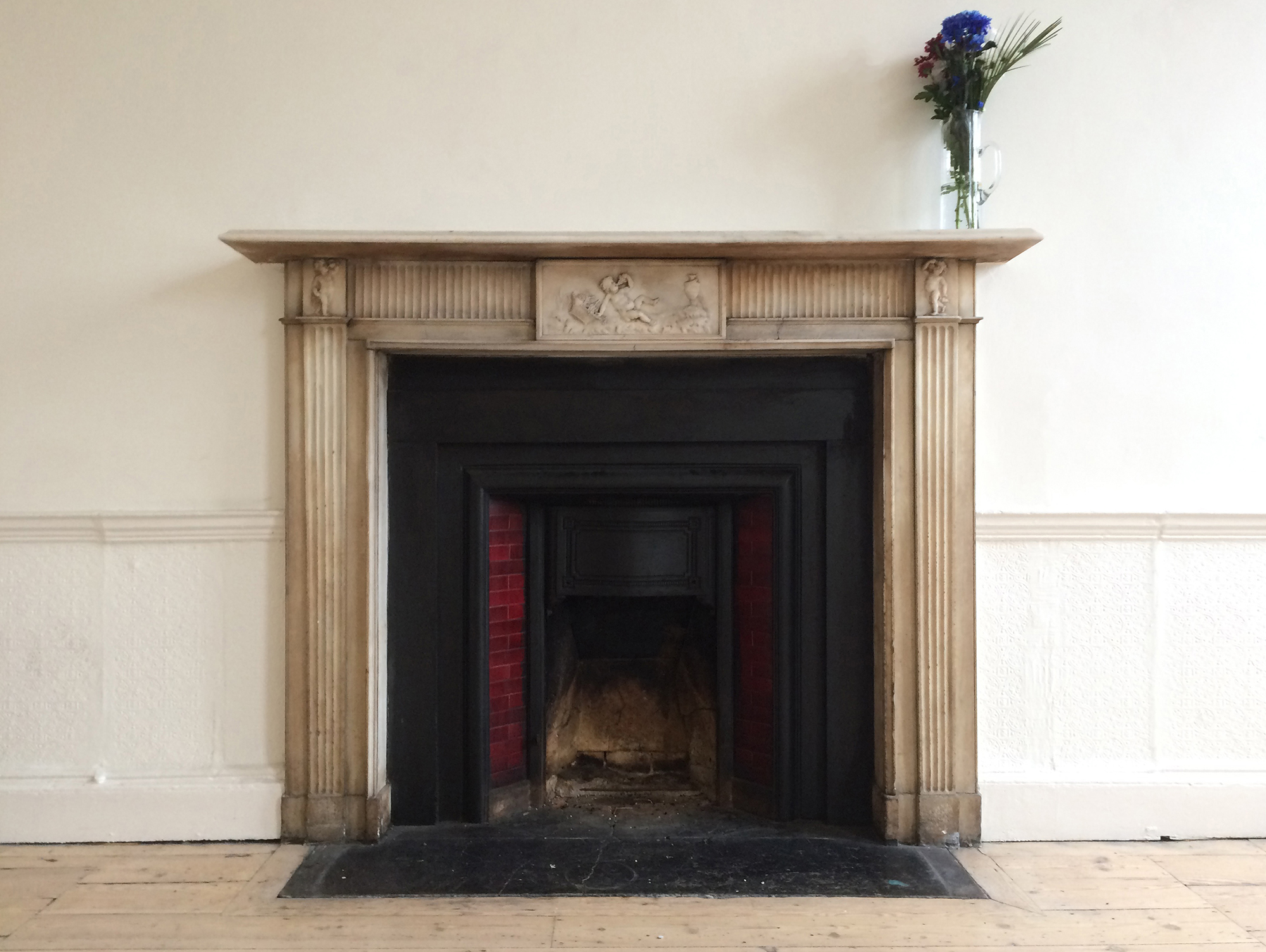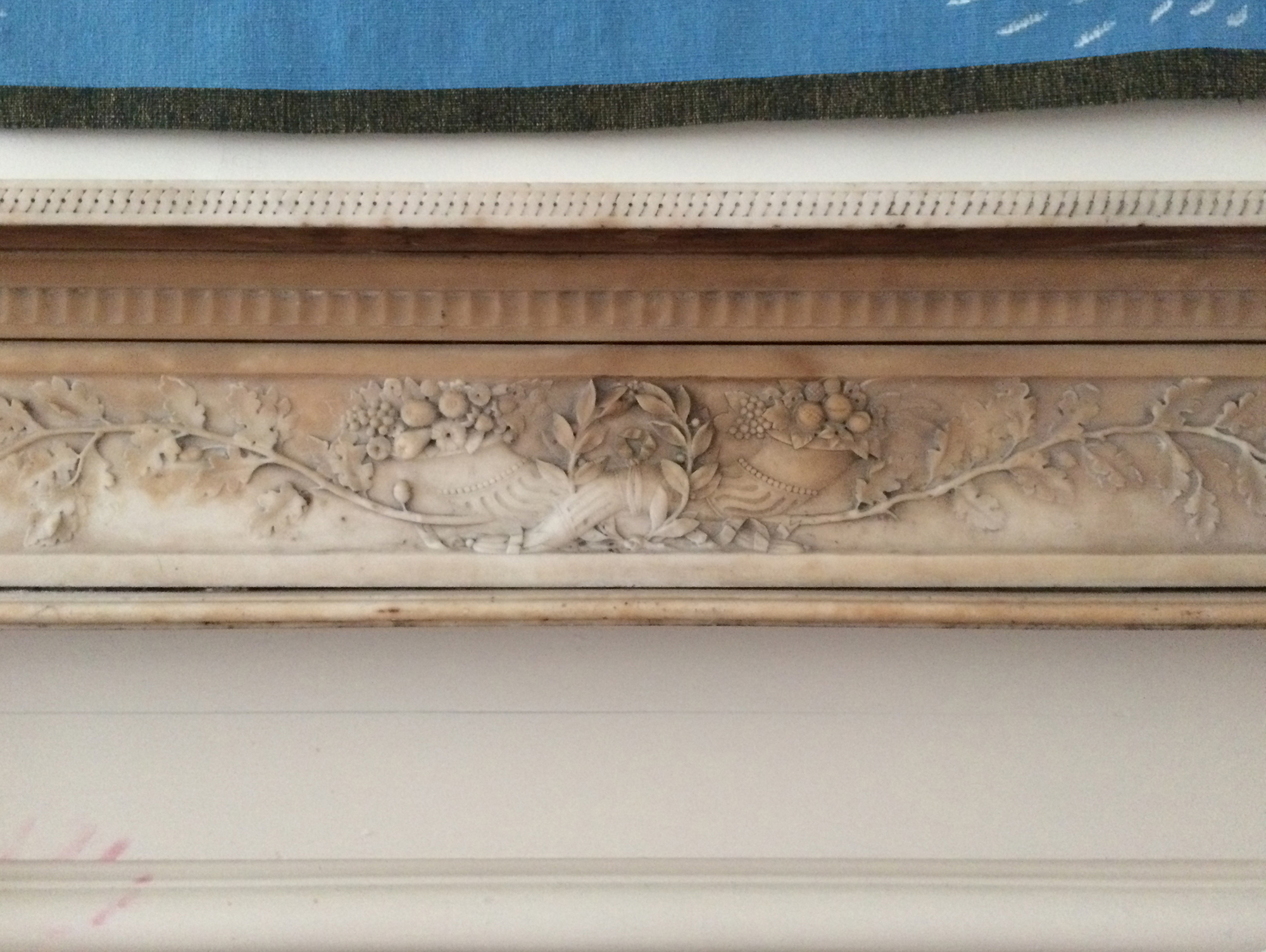 Figures 4-5: The ground floor of 11 Parnell Square was given over to an anteroom and dining room. The chimneypiece of the former includes three panels showing an increasingly unsteady baby Bacchus enjoying the fruits of the vine in their globular and liquid form indicating that the space was specifically intended for the entertainment and refreshment of visiting guests before they made their way to the adjoining room to dine. The chimneypiece in the dining room again conveys the purpose of the space with its central panel of intertwined cornucopias or horns o’ plenty: this motif reappears in plasterwork form in the uppermost floor