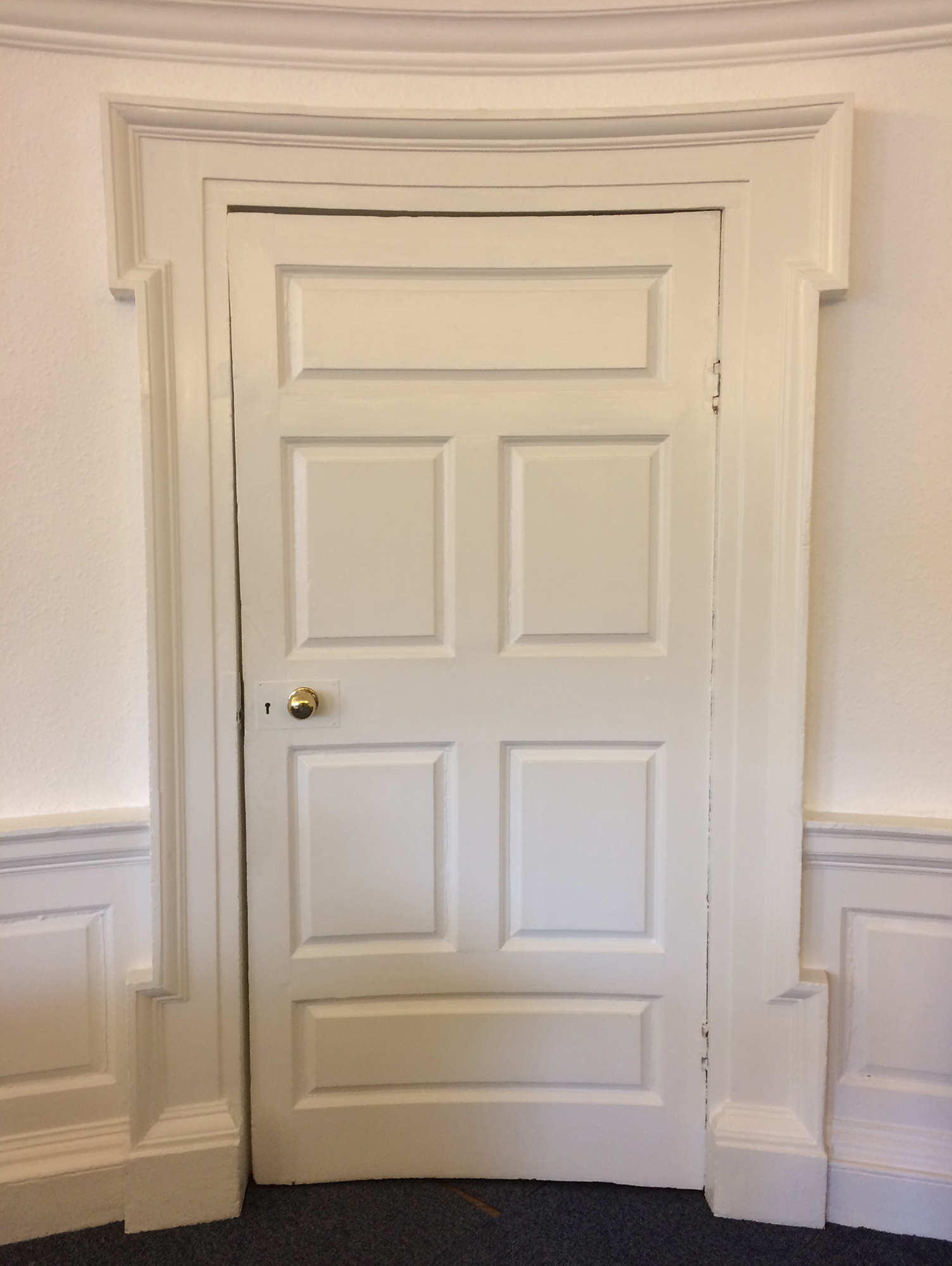 The bow-ended room on the first floor was entirely refitted in 1901 to serve as the new council chambers. Described by Christine Casey (2005) as ‘rather ponderous…in a mixture of Tudor and Celtic Revival styles’, the council chamber is panelled with oak on all sides. The chairman’s seat, designed by James Kerr and Company of Stafford Street, occupies a central position in the bow and presides over a long table with benches reserved for the Rural District of Balrothery on one side facing smaller benches for the Rural District of Celbridge and the Rural District of Rathdown on either side of a pillared fireplace. Art Nouveau sconces with lily leaf caps suspended from twisted iron stems cast soft shadows across the embossed papered walls. The strict geometry of the oak parquet floor is mirrored overhead by a low-relief fibrous plaster ceiling where neo-Tudor pierced quatrefoils are framed by a Classical plasterwork cornice and rinceau frieze. The adjoining secretary’s office was refitted in a similar fashion with timber panelling, an identical fireplace and retained eighteenth-century plasterwork cornice.