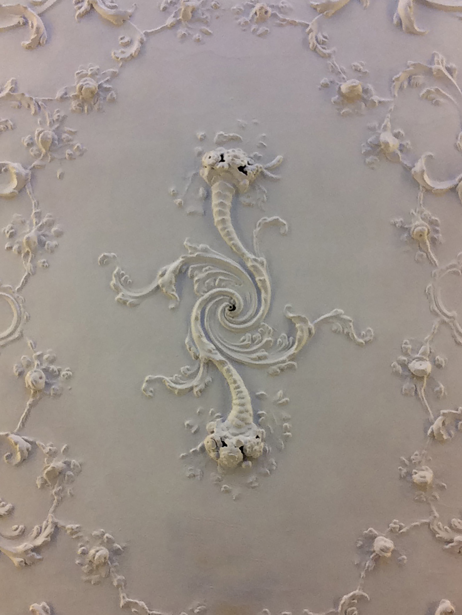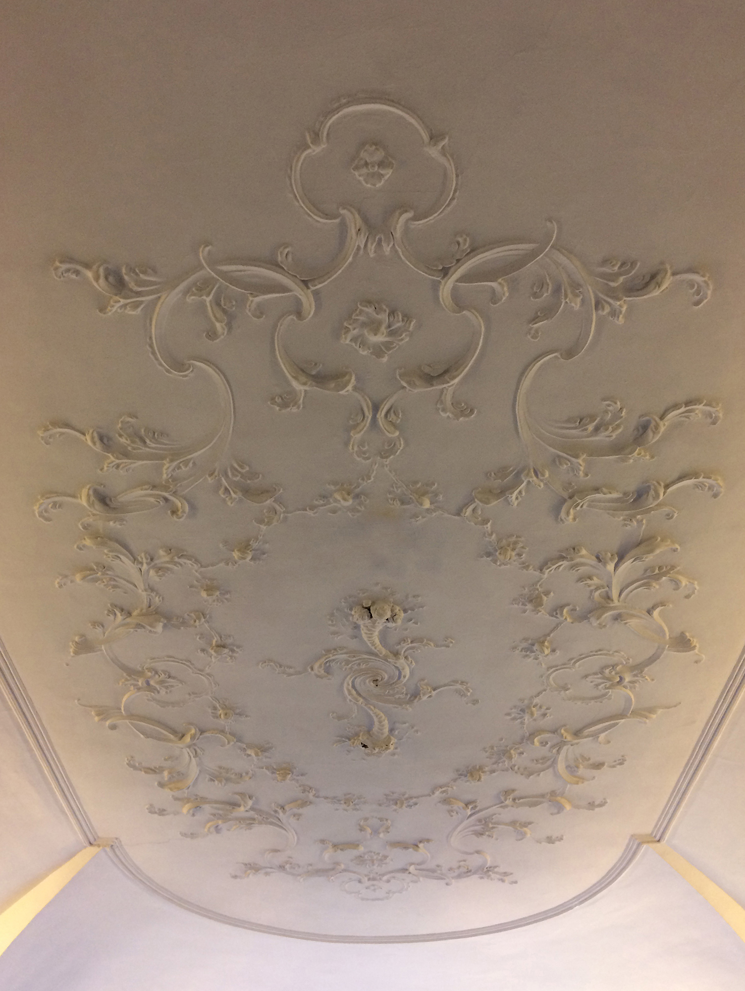 Butler’s titles as Earl of Ormonde and Ossory and Viscount Thurles were recognised in the Irish House of Lords in 1791 and, to celebrate his restored standing, he set about redecorating the interior of the house. A bill for Plastering & Stucco work done for the Right Honble The Earl of Ormonde at his House in Rutland Square is included among the papers of Bryan Bolger (d. 1834) in the National Archives of Ireland. The plasterwork was executed by Andrew Callnan (d. 1804) between September 1794 and August 1795 and in the dining room included a frieze of urns and festoons with pelta-shaped shields. The room overhead featured a frieze with hounds leaping between and over sinuous acanthus leaves*.
