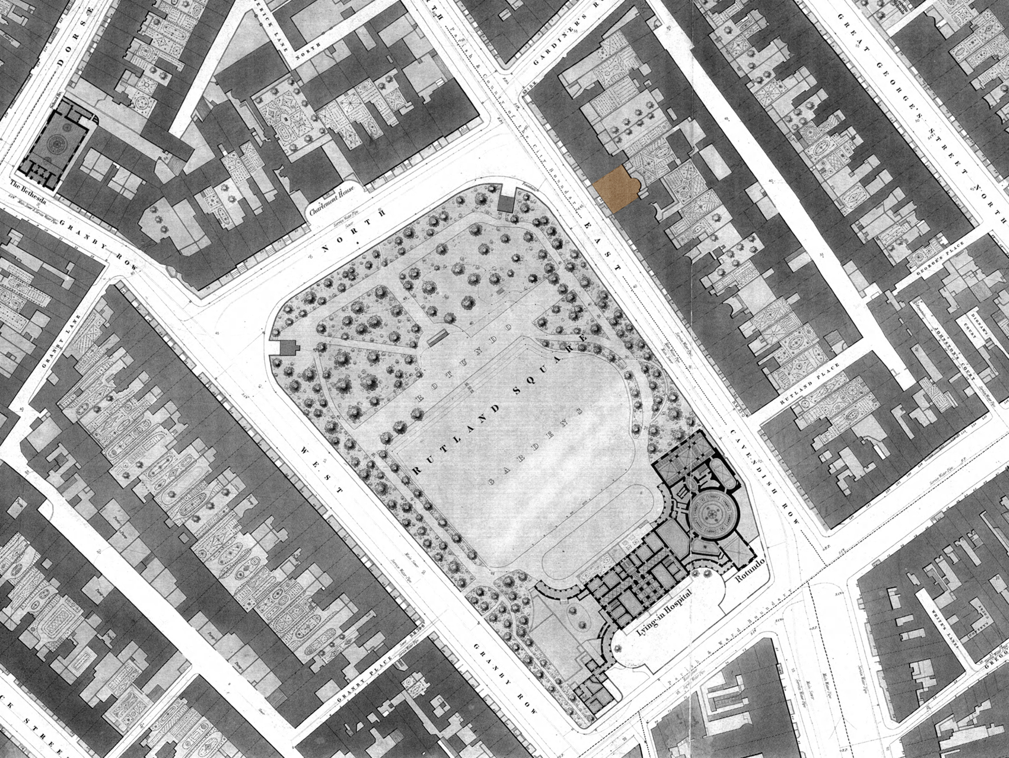 Figure 10: An extract from the Ordnance Survey (1847) showing Rutland Square [Parnell Square] when number 11 was being leased by Robert Henry French. The garden with its formal parterres was built over in the 1960s while only outlines of the “U”-shaped mews backing on to Rutland Place survive