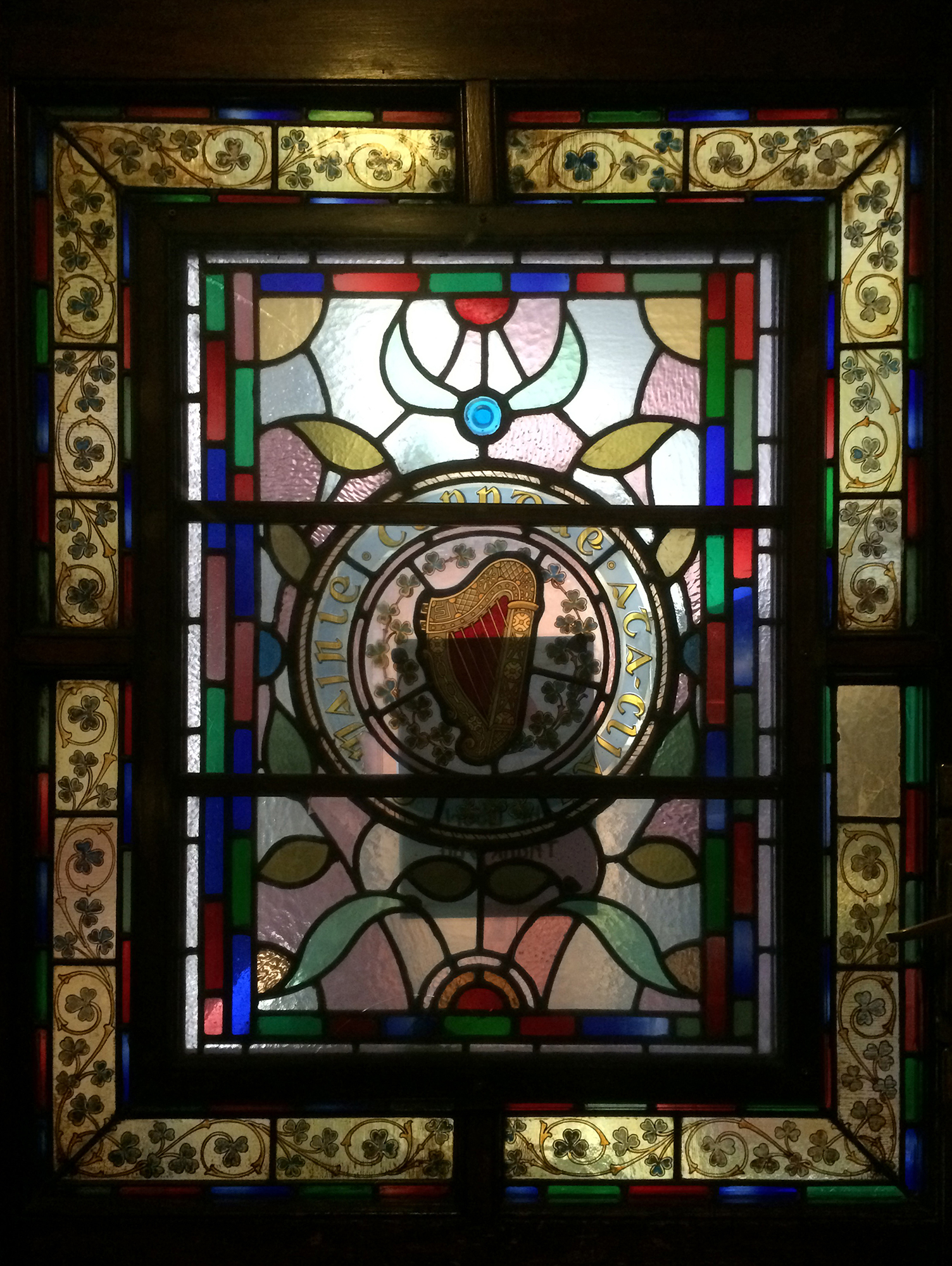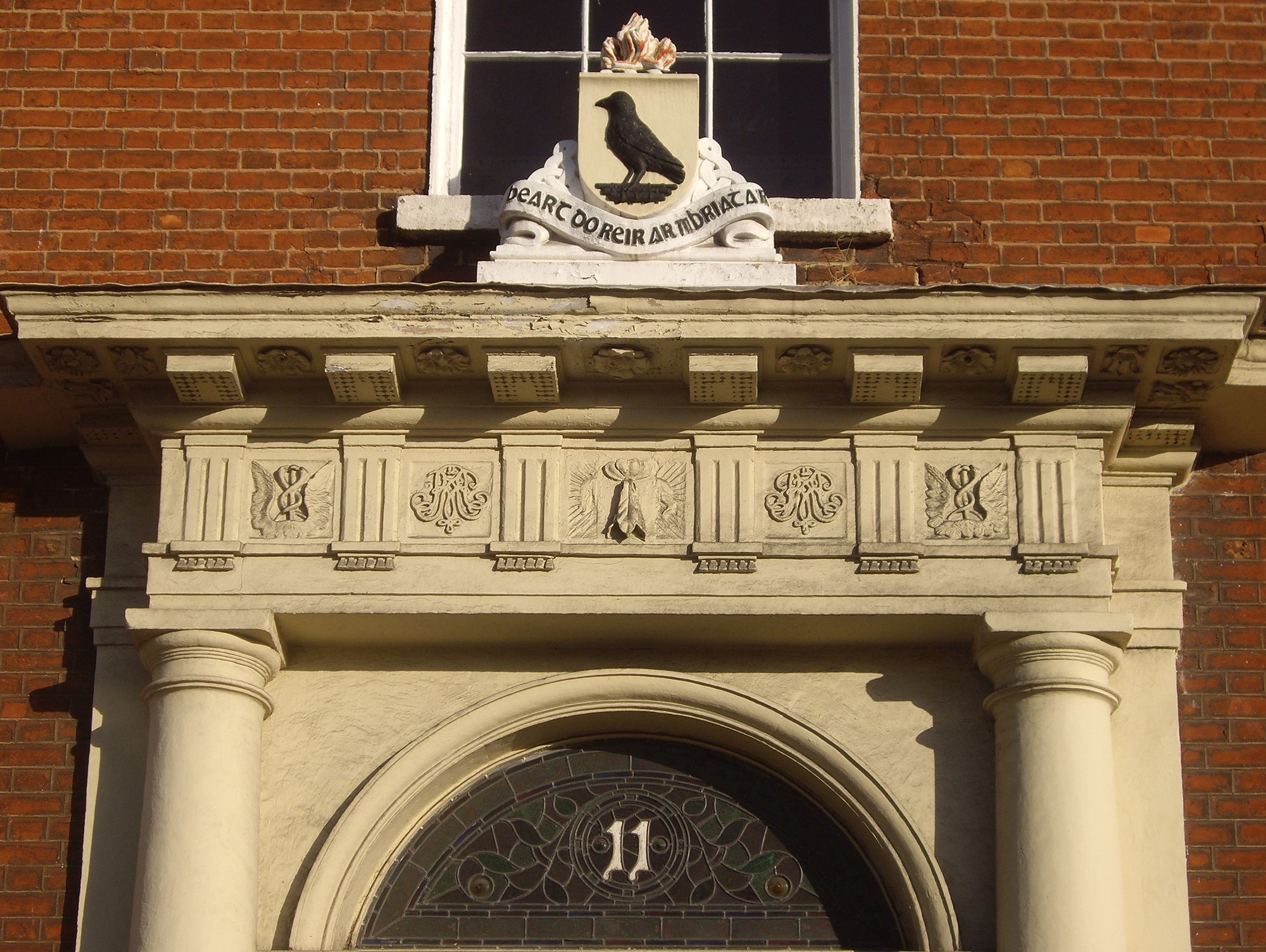 Figure 11: A detail of the doorcase showing the shamrock-framed stained glass overlight installed when 11 Parnell Square was refitted for Dublin County Council. The coat of arms, a raven standing upon a hurdle sable with a beacon proper, has been ascribed to James Dower and Sons