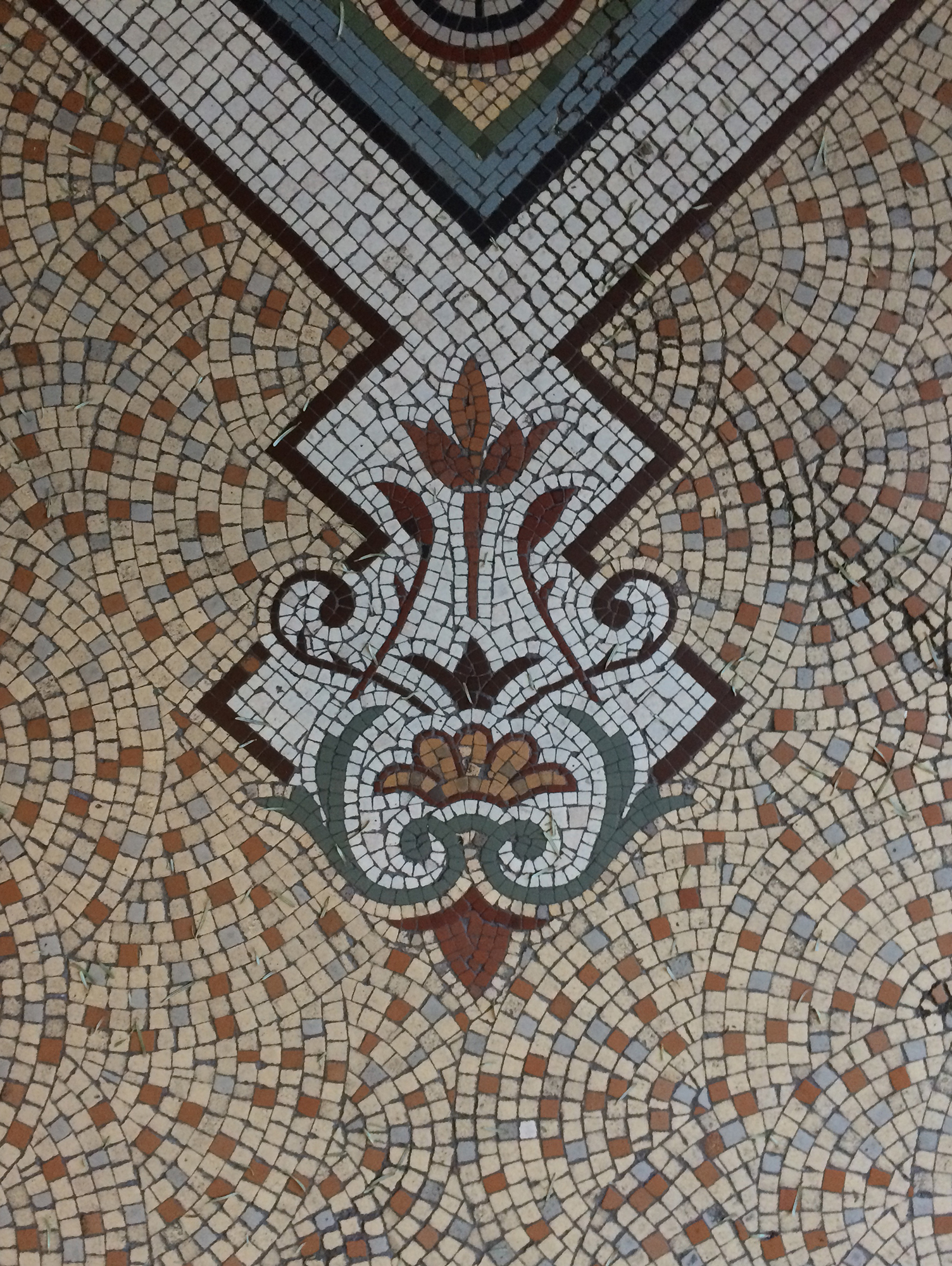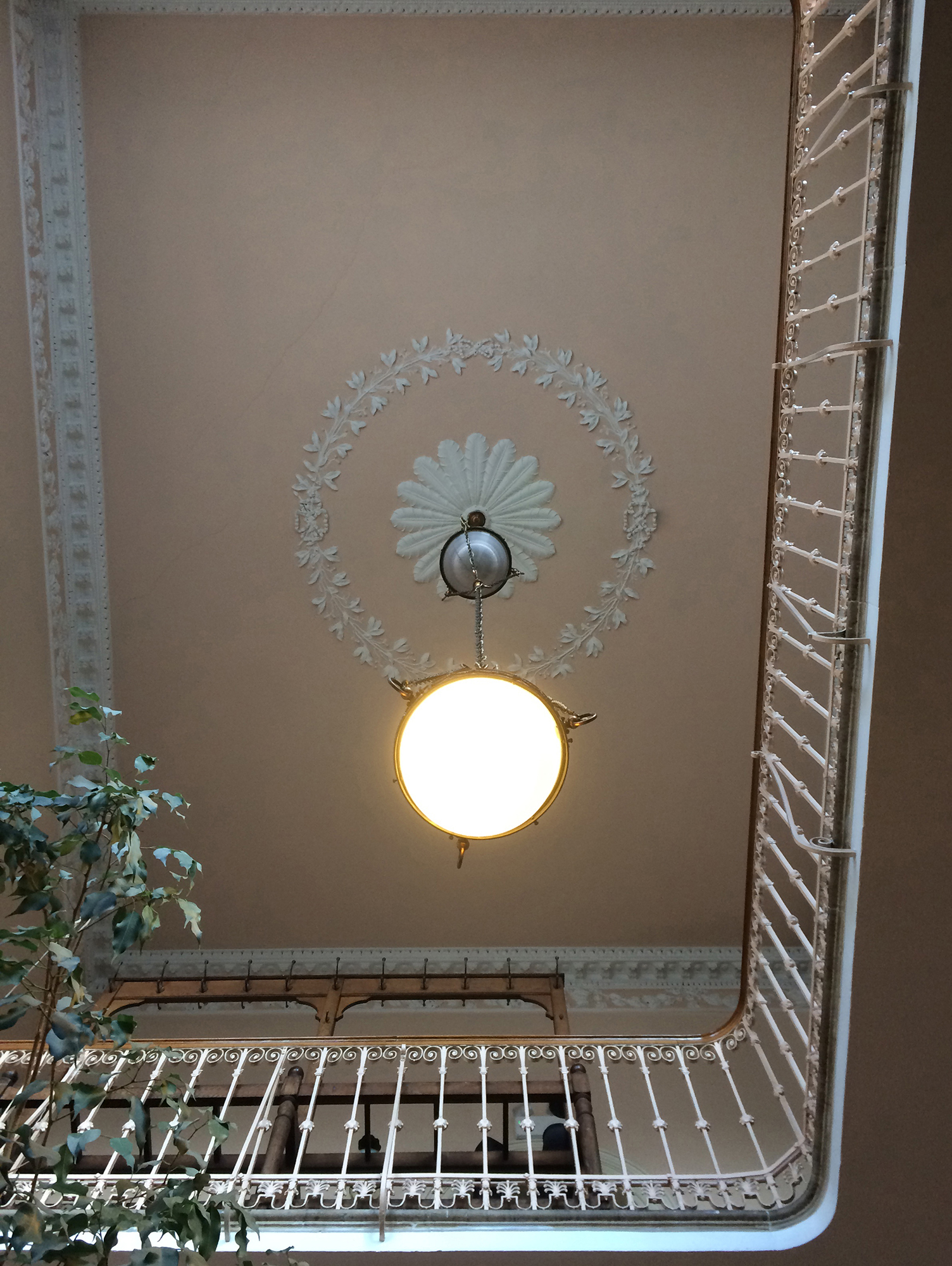 Figures 12-15: While the change of ownership had little impact on the exterior of 11 Parnell Square the interior was significantly altered under the direction of William Collen (d. 1932), County Surveyor for County Dublin (fl. 1891-1924). A draught lobby in the hall features brilliantly-coloured stained glass with Dublin County Council inscribed in Irish using traditional Cló Gaelach. A mosaic floor features sinuous patterns redolent of the Art Nouveau style. The cantilevered staircase was given a new iron work balustrade and a dado of anaglypta with panels resembling Adam-esque ceilings alternating with grouped Classical pilasters. Only the ceiling by Andrew Callnan (d. 1804) was spared a makeover meaning that the late eighteenth-century cornice and ‘Large Stucco flower’ survive intact