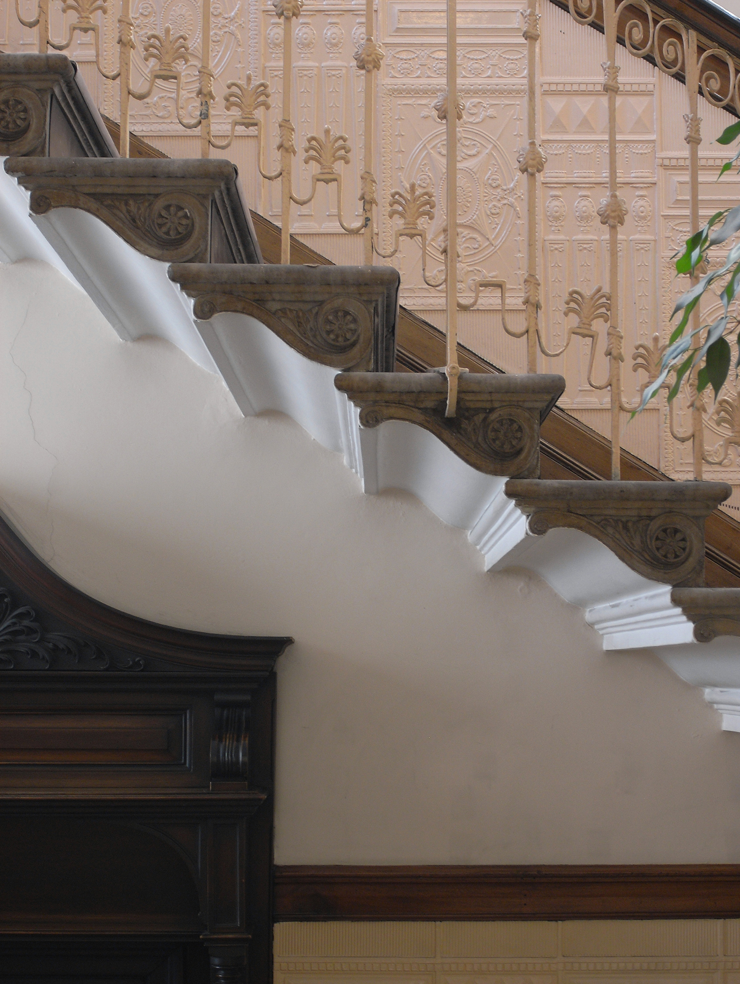 It has been suggested that number 11 was intended for John Butler MP (1740-95) of Kilkenny Castle at the outset but that, disinclined to occupy a house burdened by the hustle and bustle of the building trade, he elected reside elsewhere in the city until the piecemeal development of square neared completion. On taking possession of the property circa 1770, Butler set about improving the house by building over the carriageway to accommodate a new secondary staircase, its flights of cantilevered cut granite steps extending almost the full height of the interior from the basement to the second floor where another staircase, of timber, gives access to the top floor. The effect on the exterior was a symmetrical façade with the doorcase now centrally placed: that Butler’s neighbour similarly extended means that both houses continue to read more or less as a pair.
