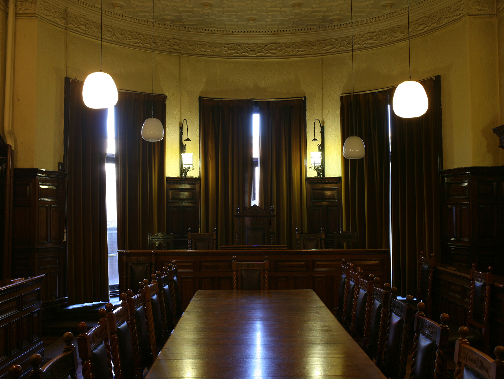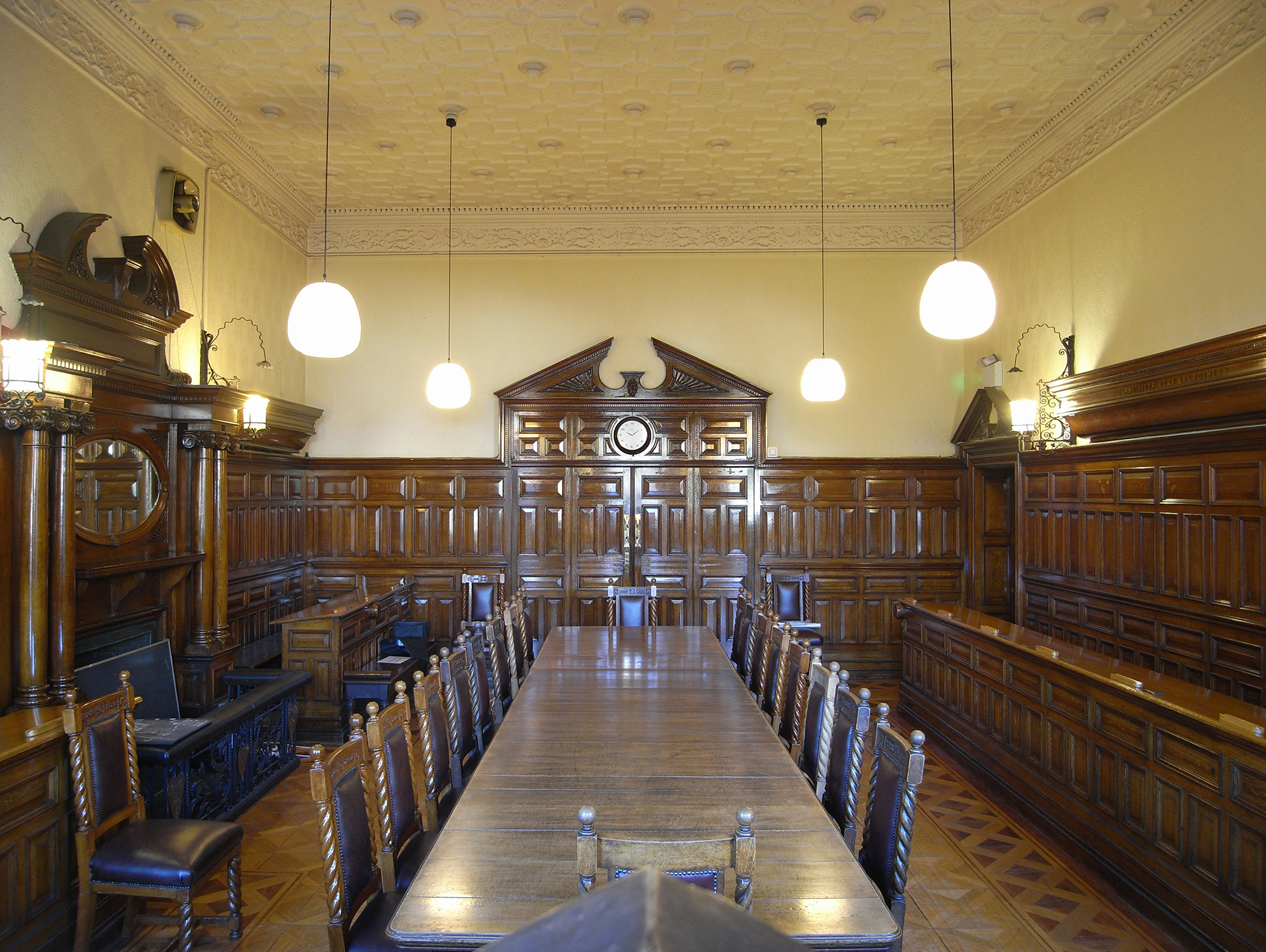 Figures 16-17: Two views of the council chamber showing the oak panelled walls, the benches reserved for the Rural District of Balrothery with a pillared chimneypiece on the opposite side, the Art Nouveau sconces, and the low-relief fibrous plaster ceiling where neo-Tudor pierced quatrefoils are framed by a Classical plasterwork cornice and rinceau frieze. The timber fittings carry discrete labels inscribed: GOODALL, LAMB & HEIGHWAY Ld. CABINET MAKERS & UPHOLSTERERS MANCHESTER. The council chamber provided the setting for the short story “Ivy Day in the Committee Room” published by James Joyce (1882-1941) in his collection Dubliners (1914)