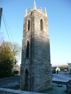 Freestanding three-stage bell tower (on square-plan), erected c. 1828 or c. 1860, formerly part of Catholic church to site (now demolished c. 1965). Stepped crenellated rubble stone parapet having cut...