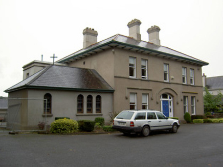 Detached three-bay two-storey former presbytery, built c. 1890, having two-bay single-storey former oratory to north elevation, with single-bay two-storey extension to rear of latter, single-bay singl...