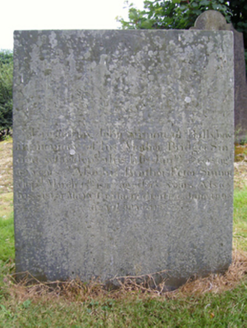 Graveyard, c. 1725, with various cut stone grave markers having coat-of-arms. Remains of detached church, c. 1725, with gable walls remaining. Now in ruins....