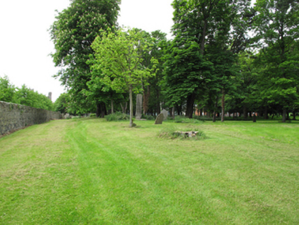 Churchyard and graveyard on irregular oval-plan, erected c. 1730, containing remains of late medieval church (LF021-033001-). Graveyard contains collection of stone grave markers dating from the eigh...