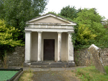 Freestanding mausoleum, erected in 1863, to north of the former Church of Ireland church. Pitched slate roof with cut limestone copings and eaves course. Coursed rubble limestone walls, partly rende...