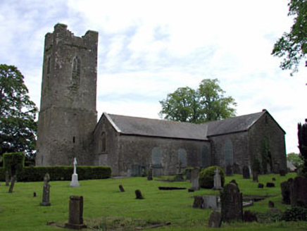 Remains of Church of Ireland church, built 1813, having three-bay elevations to nave, and three-stage square-plan tower to west. Roofless, with remains of rendered rubble limestone eaves course. Ren...