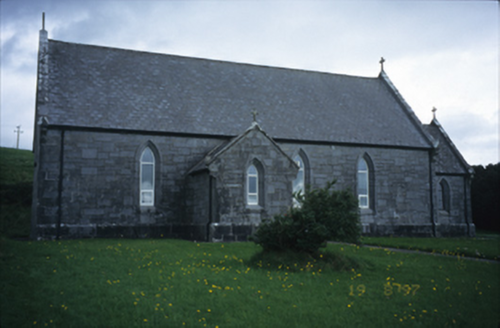Freestanding single-cell Roman Catholic church, built c.1820, having four-bay south elevation, blank north elevation, altar to east end, two-stage square-plan stepped profile tower to west end, and re...