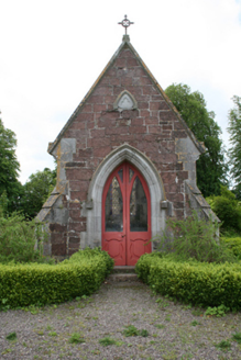 Freestanding mausoleum, built c. 1800, in graveyard containing ruins of medieval church. Hipped slate roof, with triangular pediment to entrance elevation. Coursed rubble red sandstone walls with to...