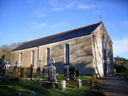 Freestanding barn style gable-fronted Roman Catholic church, built 1837, having four-bay nave and gable-fronted two-bay single-storey sacristy to rear (north) elevation. Pitched slate roof with terra...