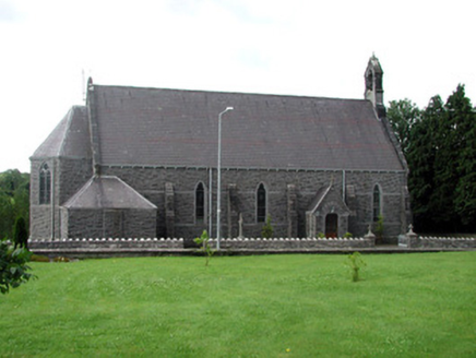 Freestanding Church of Ireland church, built 1856, having three-bay nave and single-bay chancel, two-stage projecting tower with spire and projecting gabled porch to south elevation and vestry to nort...