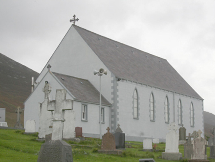 Detached five-bay Catholic church, dated 1888, with entrance porch to the south-west gable, sacristy to north-east gable. Pitched slate roof, catslide to porch with gable-fronted window, concrete gabl...
