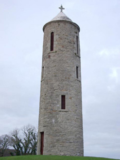 Freestanding four-stage belltower/belfry on circular-plan associated with the Catholic Church of SS Joseph & Conal (40909801), built c. 1860, having conical ashlar roof over with cut stone eaves cours...