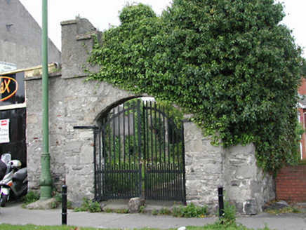 Graveyard with collection of cut-limestone markers, ob. 1719-1998. Set in landscaped grounds on a corner site with rendered diagonal piers to perimeter having chamfered capping supporting wrought iro...