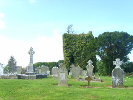 Graveyard with various cut-stone grave markers, c.1850-present. Remains of detached rubble stone medieval church, c.1600, to south comprising single-bay four-stage tower on a square plan with round...