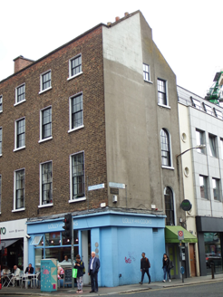 Corner-sited two-bay four-storey former house over concealed basement, built c. 1800 as one of pair, having full-height single-bay return to rear shared with No. 18. Now in use as café, with restaura...