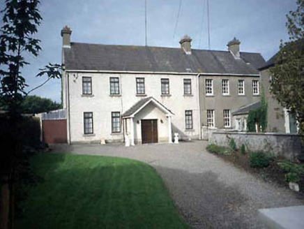 Detached three-bay two-storey house, c.1820, of two unequal parallel ranges. Large two-storey projection to south front with parallel render quoins to ground floor, corner pilasters above, and simple...