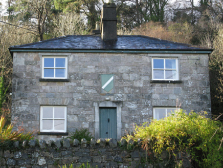 Detached two-bay two-storey former gate lodge, c. 1830, now in use as a house. Painted rubble stone and roughcast rendered walls with window openings of various profiles having timber casement window...