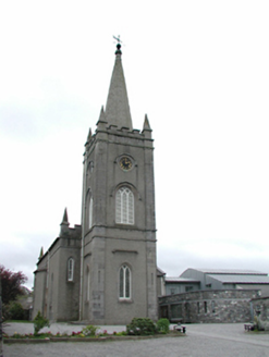 Freestanding double-height Church of Ireland church, dated 1808, with two-bay nave having curved corners and three-stage entrance tower. Now in ruins. Rubble stone walls. Cut-stone string courses a...