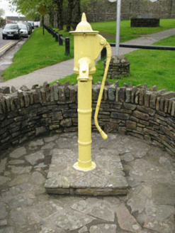 Freestanding cast-iron water pump, installed c.1870, having carved limestone trough to front (north). Banded shaft with fluted neck, spout and cap with cow tail handle. Rubble stone enclosing wall wi...