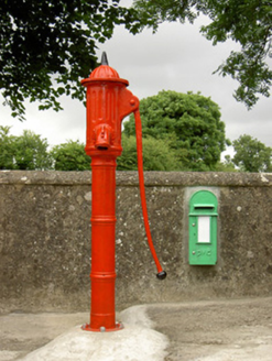Freestanding cast-iron water pump, erected c. 1880, comprising banded shaft with spout, handle and domed cap. Foundry mark to shaft. Rubble limestone wall, cobblestones to site and cast-iron hydrant...