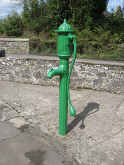 Freestanding cast-iron water pump, installed c.1870, comprising of banded cylindrical shaft with fluted neck, spout, cap with finial and cow tail handle. Now disused. Enclosed by circular rubble stone...