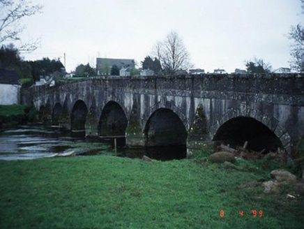 Six-arch rubble stone bridge carrying road over Awbeg River, built c. 1650, widened to north-west, upstream elevation c. 1780. Round walls and arches, with long rubble voussoirs to south-east elevati...