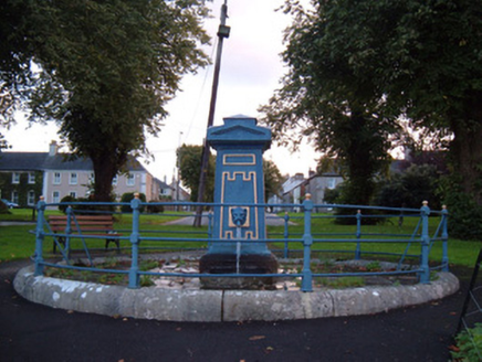 Freestanding fountain, erected c.1825, comprising painted limestone obelisk on limestone plinth, with moulded base and high relief panel detailing to faces and cap with moulded base and have cast-iron...