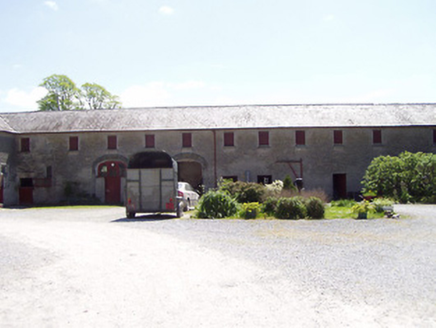 Farmyard complex, built c. 1760, comprising two main yards of outbuildings. West yard has rear of earlier house at west side, two-storey stable blocks to north and east, latter having carriageway con...