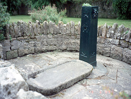Remains of freestanding cast-iron waterpump, dated 1829. Freestanding limestone basin....