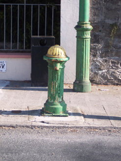 Freestanding cast-iron "lion mask" water hydrant, extant 1922. Now disused. Street fronted on concrete brick cobbled footpath....