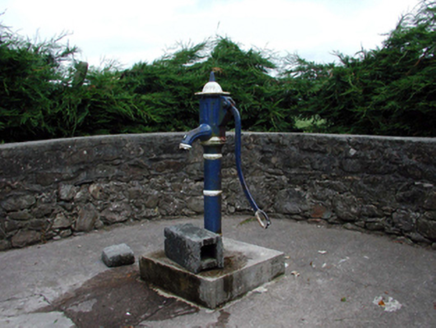 Freestanding cast-iron waterpump, c.1910, comprising fluted cylindrical shaft having open work pail stand, moulded necking with spout, and fluted ogee-domed capping having acorn finial. Now disused. ...