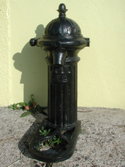 Freestanding cast-iron "lion mask" water hydrant, extant 1905. Now disused. Street fronted on concrete footpath....
