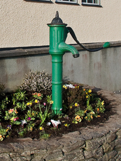 Freestanding cast-iron "cow tail" waterpump, ----. "Restored", 2010. Now disused. Road fronted with mass-concrete boundary wall to perimeter....