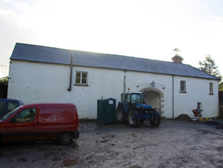 Detached three-bay two-storey house, built c. 1830, having lower, two-storey flat-roof central return to rear, and single-storey addition to west gable, connecting to farm buildings. Hipped slate roo...