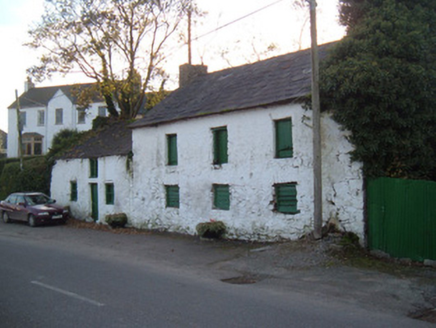 Detached three-bay two-storey house having lower three-bay two-storey building to south, built c. 1860, now disused. Pitched slate roof with rendered chimneystacks. Painted coursed rubble stone wall...