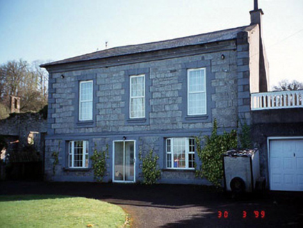 Detached four-bay two-storey building, built c.1820, now vacant. Pitched slate roof with cast-iron rainwater goods. Roughcast rendered walls. Timber battened doors. Timber sash windows with stone ...