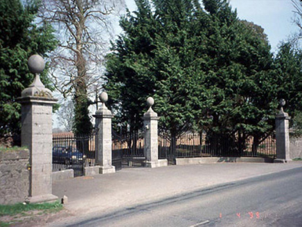 Gateway, c. 1870, comprising group of limestone ashlar piers with plinths, entablatures, ball finials and cast-iron gates and railings.