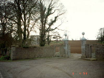 Gateway, c. 1820, comprising ashlar piers with ball finials having curved limestone walls. Replacement double and wicket iron gates, c. 1995.