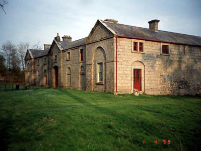 Detached seven-bay two-storey stable complex, c. 1842, on a quadrangular plan with cut stone façade having central breakfront and gabled advanced end bays.