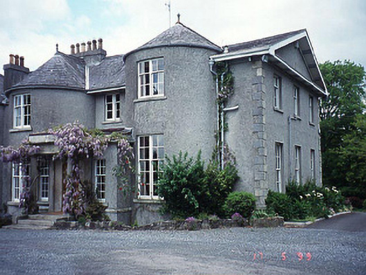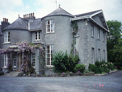 Detached three-bay two-storey over basement house, c. 1810, with projecting Doric porch to front and full-height asymmetrical bows to front and to rear. Renovated and extended, c. 1840. Group of detached outbuildings to site. Detached gate lodge to site. Gateway to site.