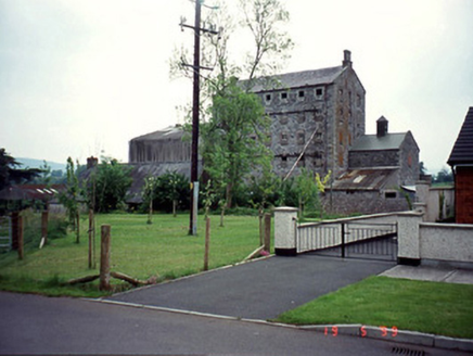 Seven-bay seven-storey mill, dated 1824, with conduited sluices and mill race. In use as a warehouse. Group of detached outbuildings, c. 1875, to site.