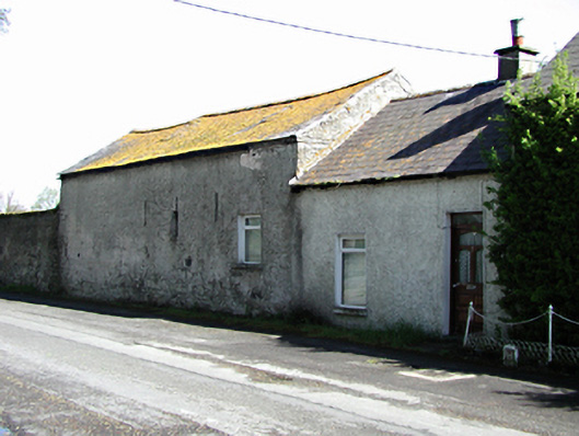 Formerly detached farm outbuilding, c.1775, partly converted for domestic use and extended to south, c.1930. Coursed rubble limestone walls, roughcast rendered to road, with three slit openings and later window opening having uPVC window. uPVC window and timber door to southern roughcast rendered extension. Pitched slate roofs, single chimney stack. Rubble stone outbuilding to north with blocked openings and lean-to slate roof. Coursed limestone rubble wall to north with limestone ashlar granite capped gate piers.
