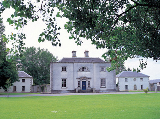 Three-bay two-storey over basement house with three-bay two-storey flanking wings, built c.1760, with rendered walls and stone quoins. House has a breakfront centre with a Diocletian window above a tripartite fanlighted and pedimented doorway.The back elevation is of one-bay on either side of a curved central bow, into which the staircae extends. Hipped slate roof with parapet, and single-storey rubble stone outbuildings. Rusticated gate piers with iron gates to site.