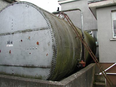 Cylindrical riveted iron plate oil tank, c.1925. c.3 metres in diameter and 6 metres in length, supported and surrounded by concrete frame. Portal to top accessed by ladder.